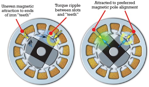 Slotted brushless motors are especially powerful because the teeth around which the copper coils are wound place the iron closer to the magnets. In this way the air gap is minimized and the magnetic circuit is completed more efficiently. As the air gap between iron and magnets is reduced, the potential torque produced by the motor is increased. However, slotted stators are known to cause cogging due to the teeth in their construction. Cogging occurs when the permanent magnets on the rotor seek a preferred alignment with the teeth and slots of the stator. Winding copper coils through the slots tends to increase this effect. As magnets pass by the teeth, they have a greater attraction to the iron of the teeth than to the air gaps between them. This uneven magnetic pull causes the cogging, which ultimately contributes to torque ripple, efficiency loss, motor vibration and noise, as well as prevents smooth motor operation at slow speeds. See Figure 3 for an illustration of cogging in a slotted motor.