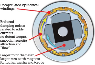Compared with slotted motors, slotless construction also can significantly reduce inductance and electrical time constant to improve current bandwidth. The teeth in a slotted motor naturally cause more inductance since the coils of copper wire around the teeth interact with the iron in a slotted motor. This interaction tends to send the current back on itself, resulting in more damping (or dragging) and impacting negatively on slotted motor response and acceleration.