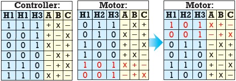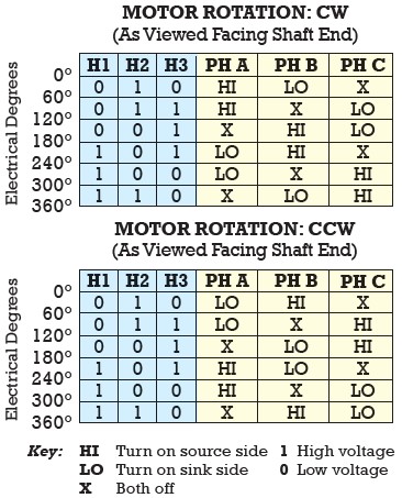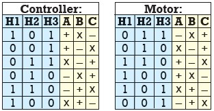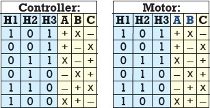 The resulting table correlating motor phase excitation to hall sensor state is illustrated below: