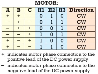 | Figure 2. Table of hall sensor states and motor phase excitation to produce the maximum torque in the desired direction of rotation. |