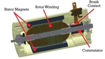 | Figure 1 - Cross sectional view of a brush motor showing the stator magnets, rotor winding, brushes and commutator. |
