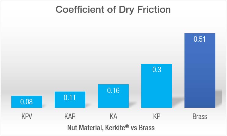 In combination with Kerkote maintenance-free coatings that achieve maximum lubrication effect on the nut/screw interface, all Kerk® leadscrew’s nuts feature custom compounded Kerkite composite self-lubricating polymers. Kerkite polymers are a family of high-performance materials that offer exceptional wear properties with the cost and design advantages afforded through injection molding.