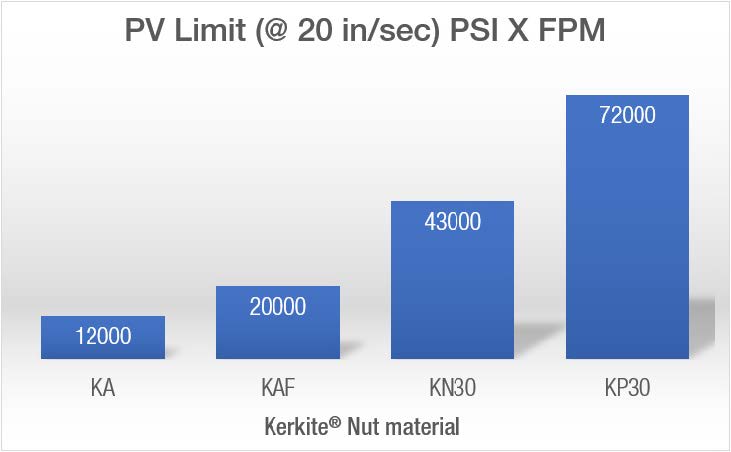 Limiting PV is a term used by manufacturers to characterize the amount of heat generation a plastic can withstand before compromising physical properties such as the geometry of the part. Every plastic has a maximum PV value defined by the manufacturer, which should only be exceeded under specific circumstances. Manufacturer’s Limiting PV values should be considered to make decisions on proper loading, speed, and duty cycle of the assembly. By designing within the proper PV envelope, the nut running against the leadscrew experiences normal linear wear rather than accelerated time to failure. Kerkite Composite Polymers are formulated in a wide range of PV values to satisfy the toughest customer’s requirements (see Fig. 2, below).