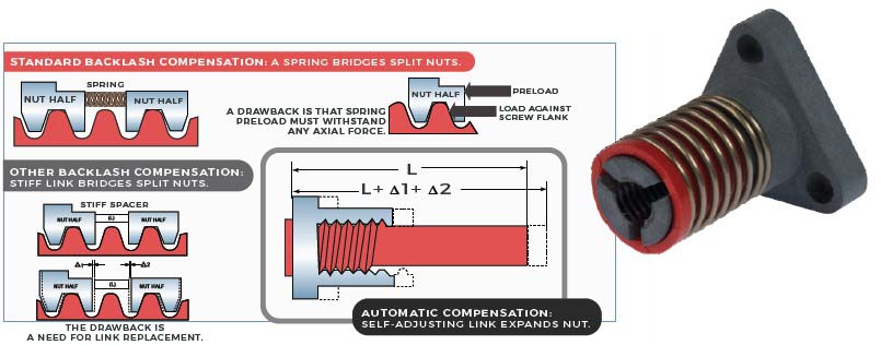 In contrast, leadscrew nuts with a stiff but expanding spacer between the nut halves avoid excessive preload by continually elongating as the nut threads wear. Such nuts carry axial loads bidirectionally with no backlash.