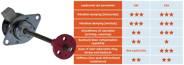 In general, anti-backlash nut technology that removes radial clearance (such as the ZBA) has favorable noise and vibration damping characteristics over anti-backlash nut technology that removes axial clearances. This makes them particularly well suited for applications that require smooth motion — as in scanning, printing, and plotting, for example.