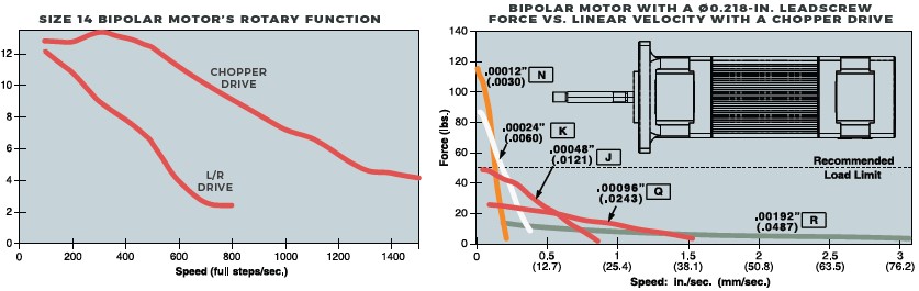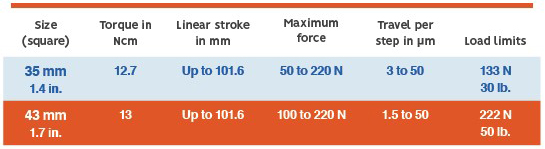 Haydon Kerk can custom manufacture dual-motion actuators to application requirements, and design engineers can set numerous operating parameters during integration … as dual-motion actuators accept controls via standard two-axis stepper-motor drives, chopper drives, and micro-stepping drives. Below is a chart of the capabilities of two Haydon Kerk dual-motion actuator models — the 35000 Series based on a Size 14 hybrid stepper motor and the 43000 Series based on a Size 17 hybrid stepper motor. Note that standard strokes are 1, 2, and 4 in. (25.4, 50.8, and 101.6 mm). Standard motors are Class B rated to 130° C.