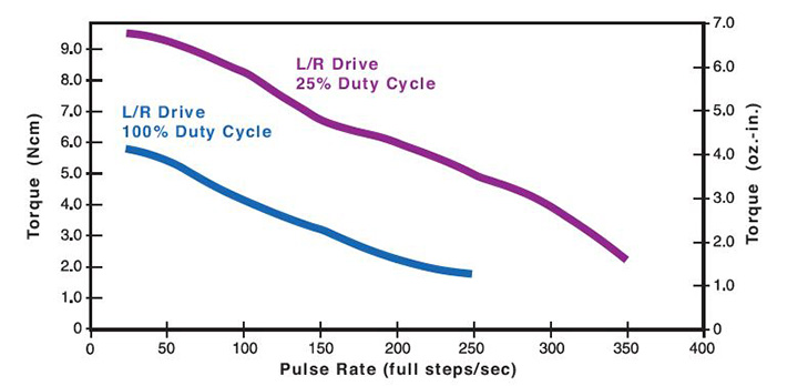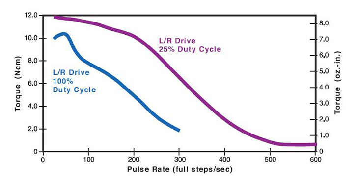 Bei L/R-Antrieben werden die Spitzenkraft und die Drehzahlen reduziert, bei Verwendung eines unipolaren Antriebs wird eine weitere Reduzierung der Kraft um 30 % erreicht.